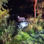 Com a força do impacto, o Fiat/Punto pegou fogo e despencou em uma ribanceira.