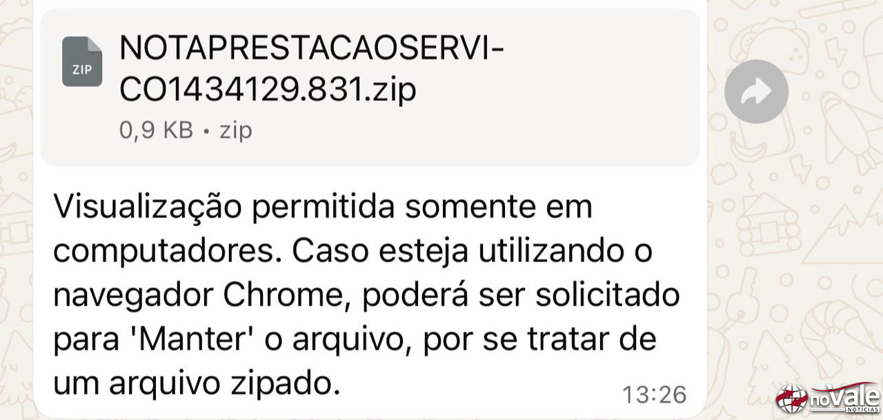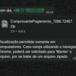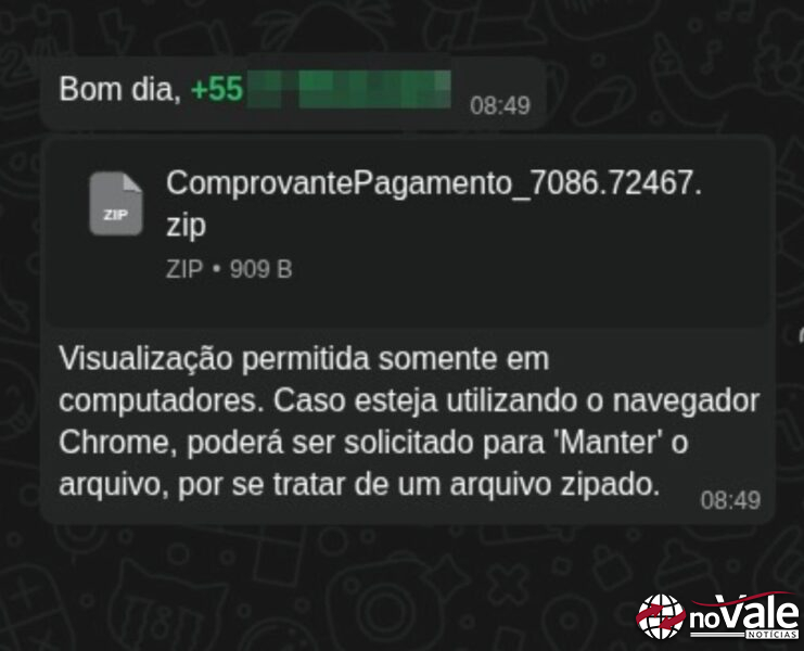 Um novo golpe que está sendo aplicado através do WhatsApp vem sendo denunciado por comunidades tecnológicas em diferentes regiões. A fraude utiliza um arquivo compactado (.zip), que é enviado como mensagem pelos golpista, descrito como “comprovante” ou “nota fiscal”, acompanhado da orientação de que a visualização “só é permitida em computadores”.