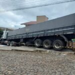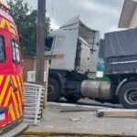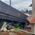 Uma carreta Scania branca com placas de Videira saiu da pista e colidiu contra o muro de uma residência na Rua Rosa Gaio, no Bairro Morada do Sol, em Videira, na manhã desta quinta-feira (25). O acidente aconteceu por volta das 8h34min e, por sorte, não houve feridos.