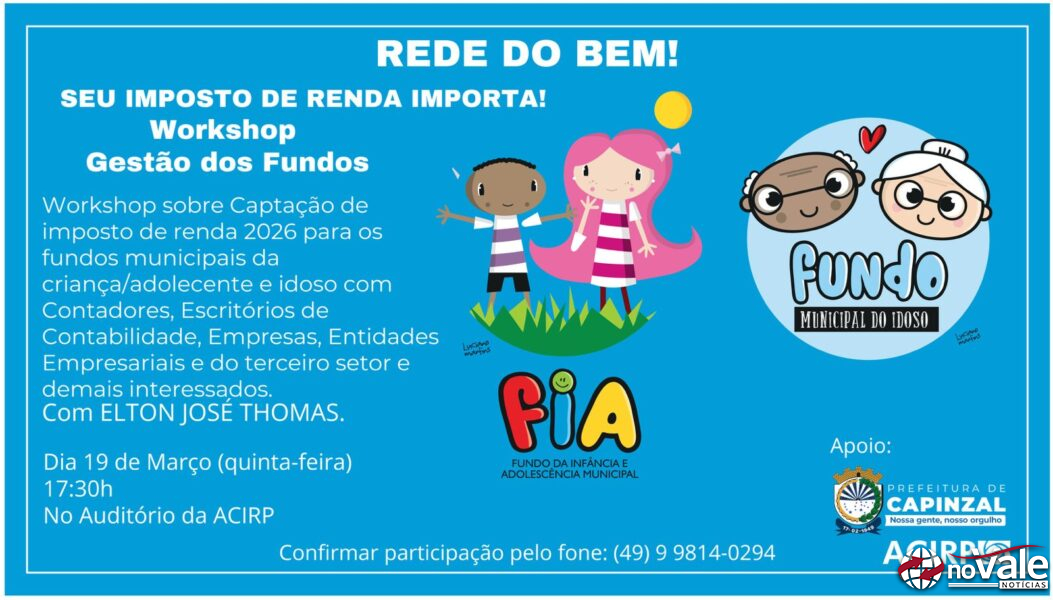 Um workshop voltado à gestão e captação de recursos para fundos municipais será realizado na próxima quinta-feira, 19 de março, em Capinzal. A atividade integra a iniciativa “Rede do Bem – Seu Imposto de Renda Importa!” e tem como objetivo orientar sobre a destinação de parte do imposto de renda para projetos sociais do município.