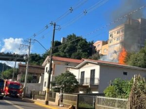 Uma casa foi completamente destruída por um incêndio na tarde deste domingo (30) no centro de Herval d’Oeste. As chamas se alastraram rapidamente pelo imóvel, localizado nos fundos da Avenida Beira Rio, no sentido da UPA, e chegaram a atingir o telhado de uma residência vizinha.