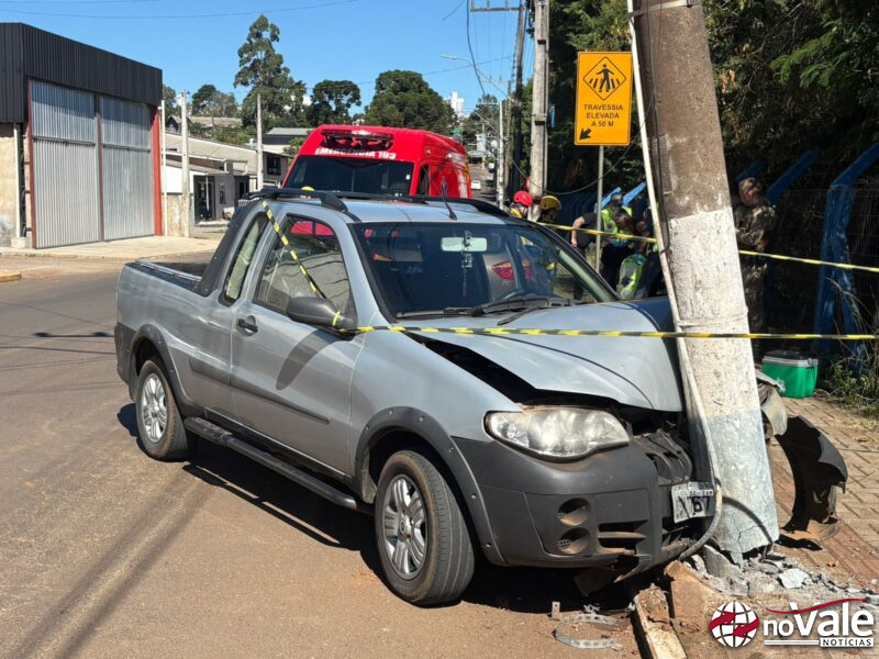 No local, uma picape Fiat Strada colidiu contra um poste após o motorista perder o controle da direção. A imagem mostra que a parte frontal do veículo ficou bastante danificada com o impacto.