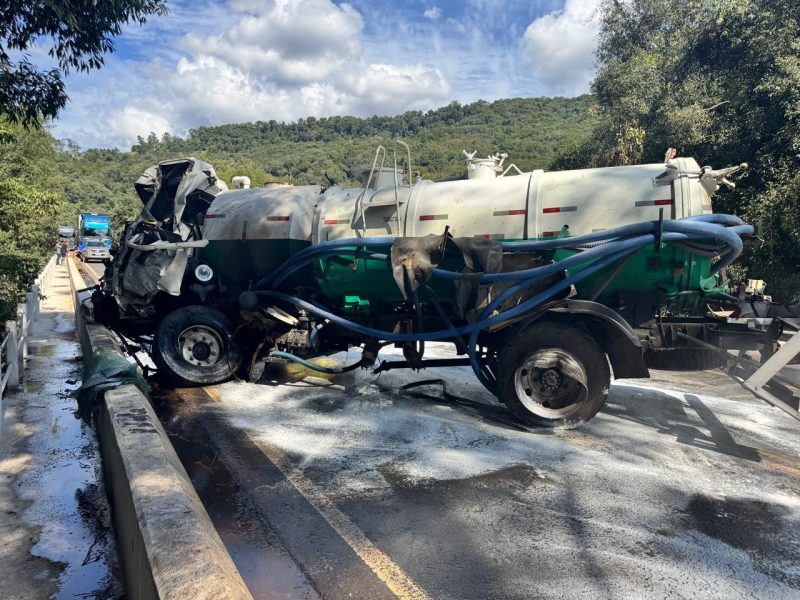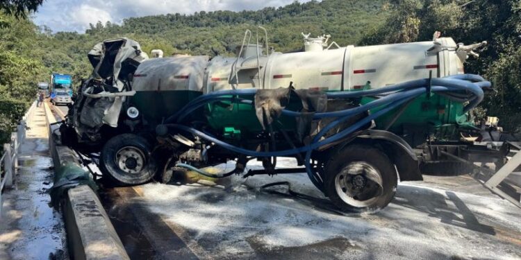 A colisão, ocorrida por volta das 11h30, envolveu uma carreta e um caminhão-tanque, modelo Ford Cargo. Com o impacto, o caminhão-tanque permaneceu sobre a ponte, enquanto a carreta saiu da pista e desceu um barranco às margens da rodovia.