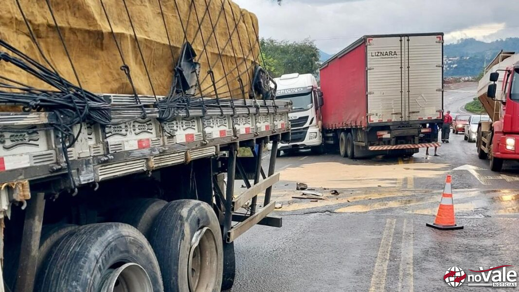 O acidente ocorreu quando o caminhão Volvo de São Bento do Sul colidiu na lateral dos dois outros veículos envolvidos.