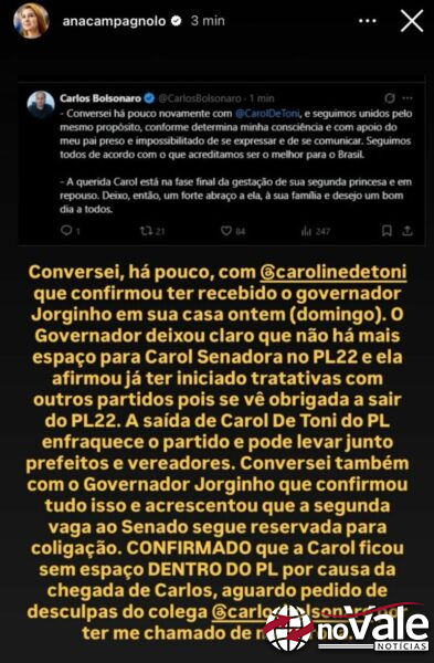 A deputada estadual Ana Caroline Campagnolo (PL) publicou, na segunda-feira, dia 3, que conversou com a deputada federal Carol de Toni (PL) sobre o impasse a respeito da vaga ao Senado.
