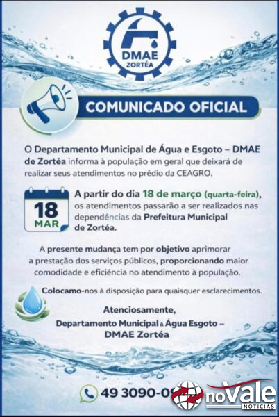 O Departamento Municipal de Água e Esgoto (DMAE) de Zortéa informou uma alteração no local de atendimento ao público no município. Conforme comunicado oficial, os serviços deixarão de ser prestados no prédio da CEAGRO.