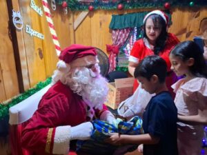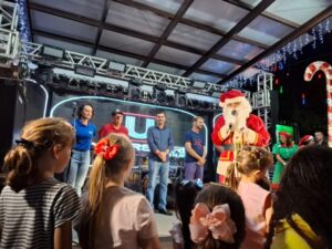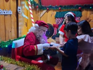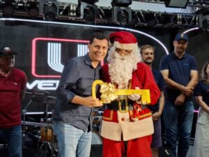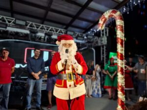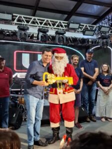 A noite começou com um momento simbólico e especial: o Papai Noel devolveu a chave da cidade ao prefeito Claudir Duarte (Dire), marcando o fim das festividades. Em seguida, ele recebeu as crianças em sua casinha, onde ouviu pedidos, recolheu cartinhas e entregou doces.