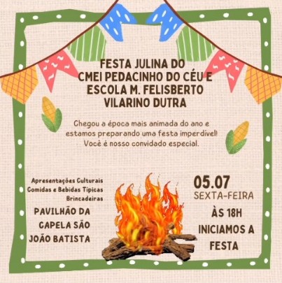 Acontece na noite desta sexta-feira (05), a festa Julina da Escola Municipal Felisberto Vilarino Dutra e do Centro Municipal de Educação Infantil Pedacinho do Céu, de Ouro.