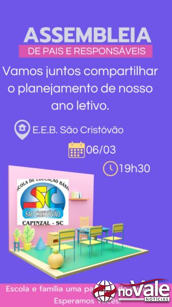 A Escola de Educação Básica São Cristóvão, realiza nesta quarta-feira, dia 6, a Assembleia de Pais. Estão convidados para participar da reunião toda a comunidade escolar, incluindo, pais, alunos e familiares.