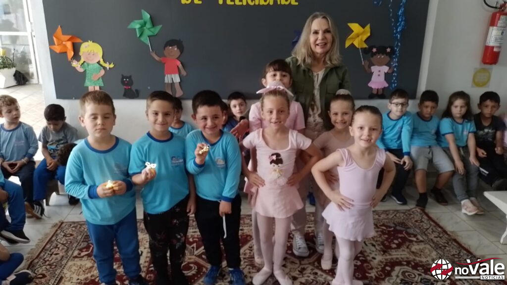As crianças entregaram algumas lembranças e a homenagearam com a dança, partindo da história “Asas de Pirilampo”.