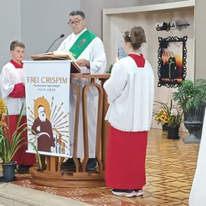 A celebração foi presidida pelo Frei José Carlos Gubert, com a participação do Diácono Anoldo Gonçalves Walter. A liturgia ficou sob a responsabilidade da equipe dos Devotos de Frei Crispim, grupo que acompanha a organização das atividades religiosas em honra ao frei.