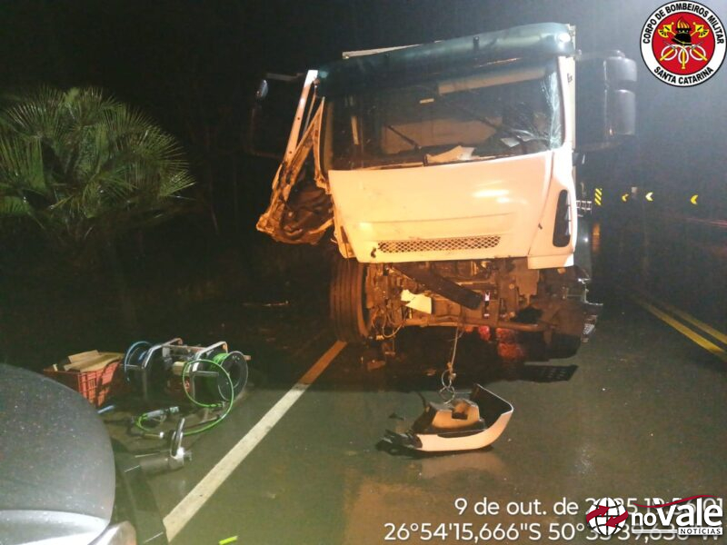 De acordo com informações do Corpo de Bombeiros Militar de Lebon Régis, a colisão foi transversal e envolveu um veículo Volkswagen Polo e um caminhão Iveco Tector 310. No automóvel estavam três ocupantes, todos homens, que ficaram feridos dois deles presos às ferragens.