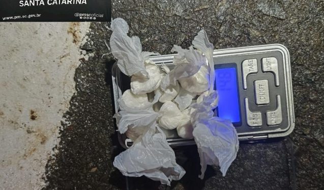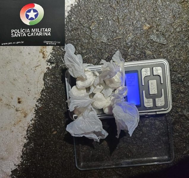 Durante a revista pessoal e nas buscas no automóvel, os policiais localizaram nove invólucros de cocaína, totalizando aproximadamente 14,8 gramas, além de materiais utilizados para o fracionamento da droga.
