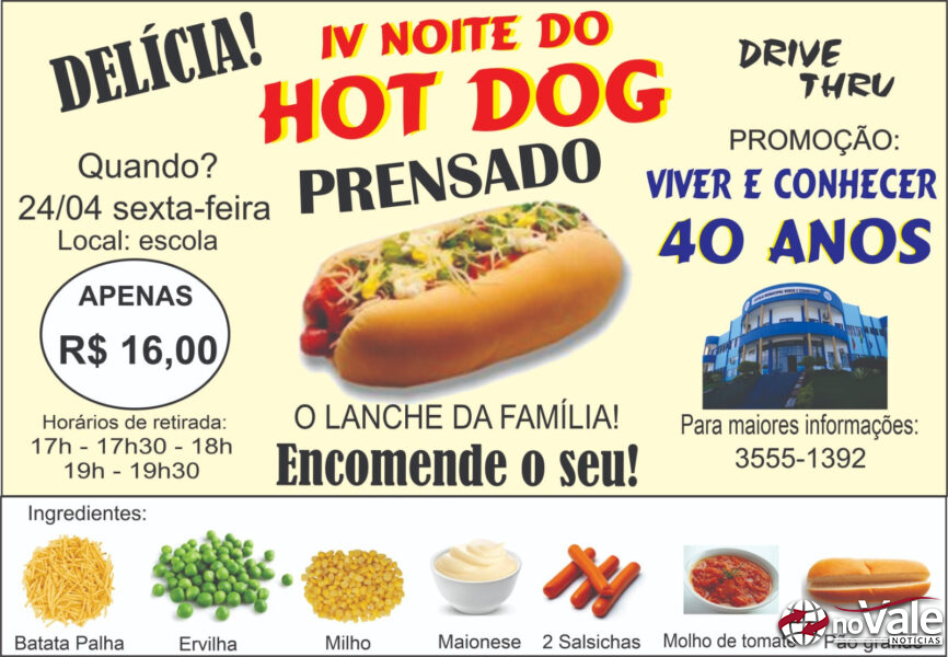 A comunidade está convidada a participar da IV Noite do Hot Dog Prensado, que será realizada na sexta-feira, dia 24 de abril, em Capinzal. O evento acontece na Escola Viver e Conhecer com sistema drive-thru para retirada dos lanches.