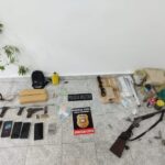 Durante a ação foram apreendidos, uma espingarda, uma pistola, uma arma de fogo artesanal, um pé de planta com características de maconha, dois torrões e meio de substância análoga a maconha, uma pedra média de substância análoga a crack, cerca de 33 pedras pequenas de substância análoga a crack, 8 munições calibre .38, apetrechos e insumos para recarga de munição (estojos, pólvora, esferas), apetrechos para fracionamento de drogas.
