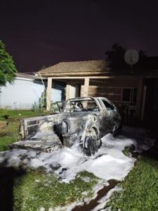 O veículo estava estacionado em frente à residência de uma mulher iniciais LSC, de 45 anos. Durante o atendimento, os bombeiros identificaram também um pequeno foco de incêndio na parte posterior da casa, em uma parede de madeira. Segundo relato do homem, ele notou as chamas na residência após ser alertado pelo filho da proprietária, que havia percebido o incêndio no automóvel. O próprio homem agiu rapidamente para apagar o fogo na parede, evitando maiores danos – a área ficou apenas com marcas de combustão.