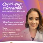 O terceiro eixo é o “Laços que Educam as Infâncias”, que abordará o desenvolvimento cognitivo e da linguagem. A palestra será realizada no dia 2 de outubro, às 19h, no mesmo local, com a fonoaudióloga Daniela Mortoli e a neuropsicopedagoga Lucimar Franck.