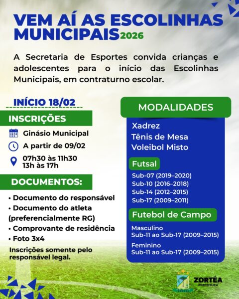 A Secretaria Municipal de Esportes, anunciou o início das Escolinhas Municipais de Esportes para o ano de 2026. O projeto é voltado a crianças e adolescentes e tem como objetivo incentivar a prática esportiva, a convivência social e o desenvolvimento físico, com atividades realizadas no contraturno escolar.