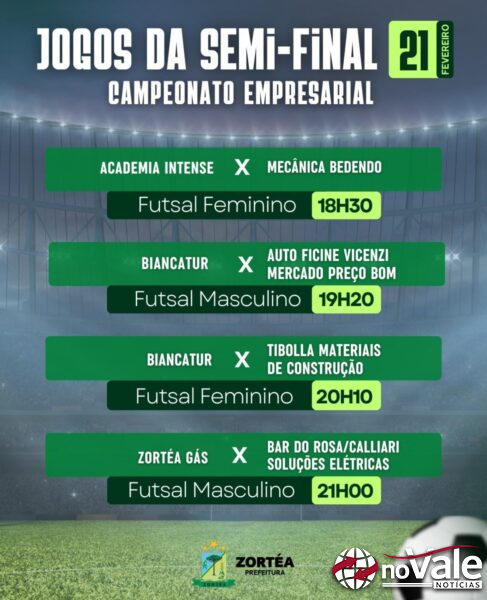 As semifinais do Campeonato Empresarial de Futsal serão realizadas nesta sábado, dia 21 de fevereiro, em Zortéa, reunindo equipes nas categorias feminina e masculina em uma noite decisiva da competição.