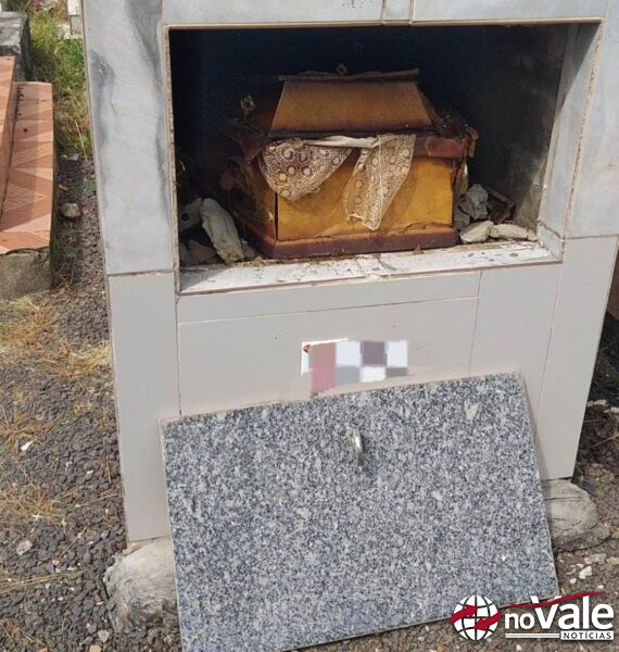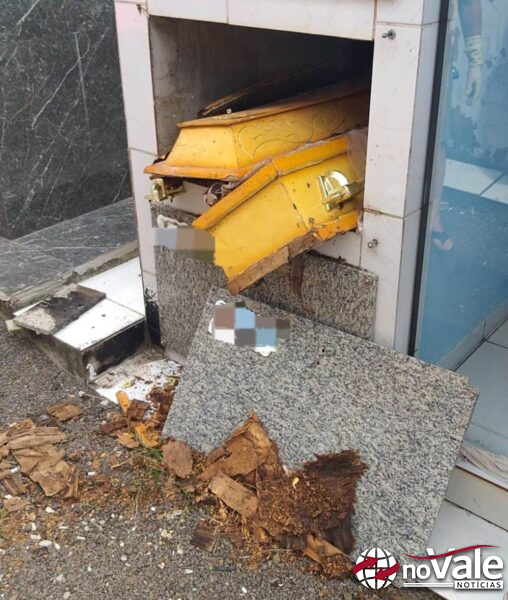 Em um dos atos, os vândalos chegaram a quebrar o caixão, que ficou parcialmente fora da gaveta, que teve a abertura totalmente rompida.
