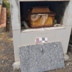 A outra sepultura violada também é de gaveta. A placa de granito que fechava o túmulo foi deixada em frente ao local depois da abertura.