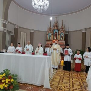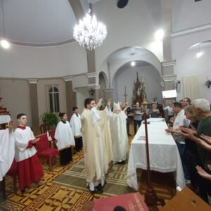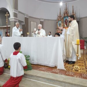 A celebração foi concelebrada pelo padre Gilvani Cordeiro, pelo frei Ivo Lazzarotto e pelo bispo da Diocese, Dom Frei Mario Marquez. A liturgia foi conduzida pela equipe de Devotos de Frei Crispim.