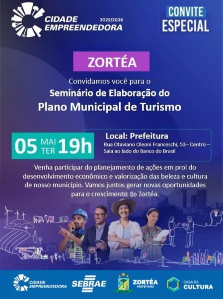A organização convida toda a comunidade para participar do evento, especialmente associações, empreendedores, agricultores, grupos de mulheres e demais representantes da sociedade civil. A proposta é reunir diferentes ideias e contribuições para fortalecer o setor turístico de Zortéa.
